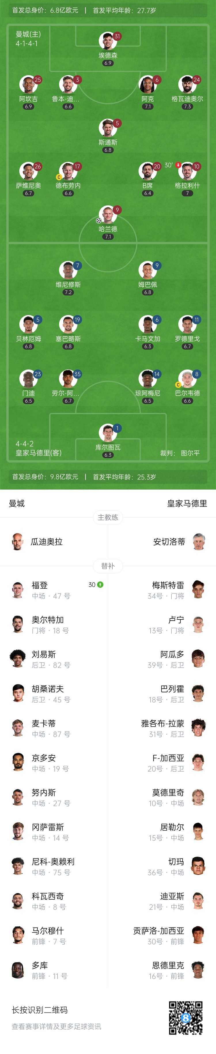 第19分钟,格拉利什左路送出挑传,格瓦迪奥尔胸部停球给哈兰德,后者顺势推射得手,曼城1-0皇马。↓