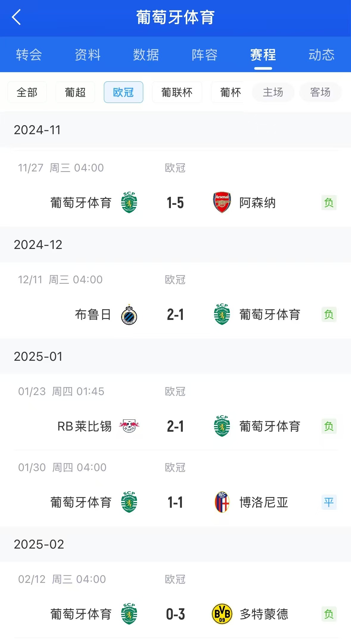 02月12日讯 欧冠淘汰赛附加赛首回合,葡萄牙体育主场0-3不敌多特。球队在阿莫林离任后,5场欧冠比赛1平4负未尝一胜。