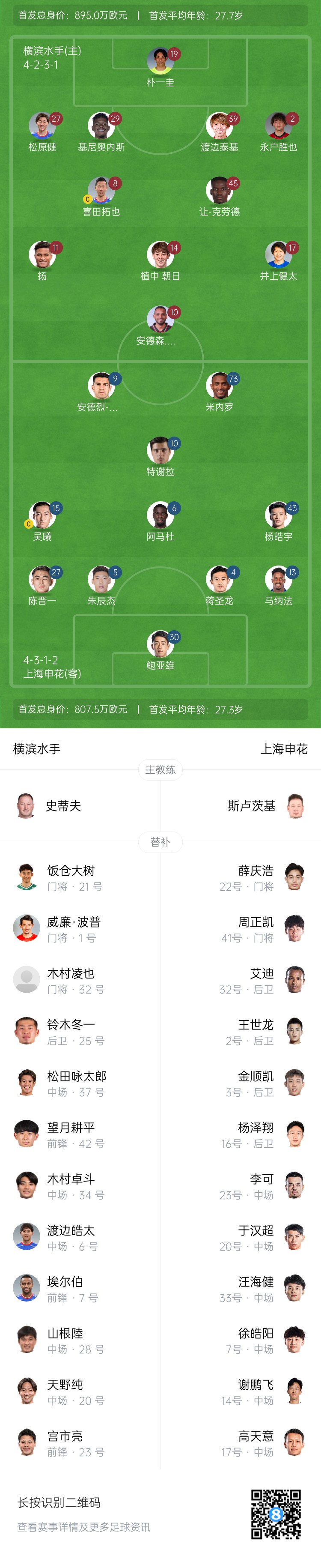 申花vs横滨水手首发:米内罗、特谢拉先发,吴曦、18岁杨皓宇出战