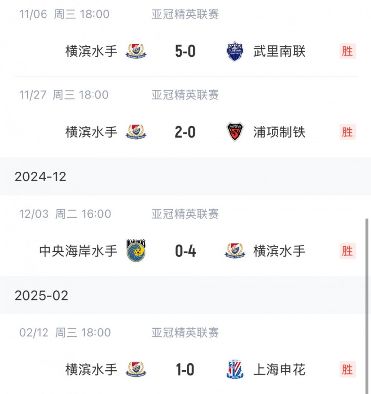 横滨水手近4轮亚冠精英联赛成绩↓↓↓