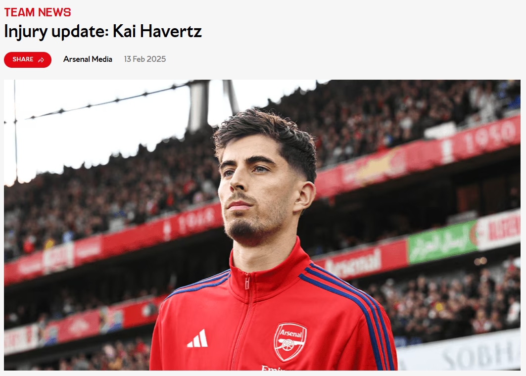 赛季报销!官方:哈弗茨训练中腿筋受伤,未来几天接受手术