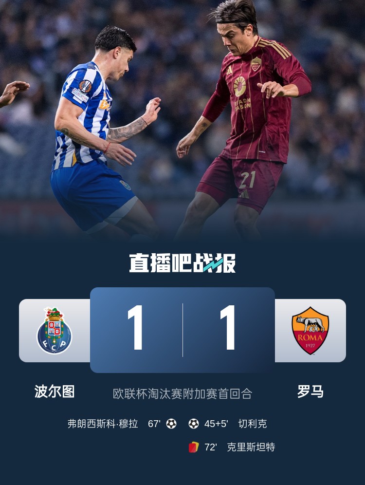 迪巴拉伤退、克里斯坦特被罚下,首回合十人罗马1-1波尔图。